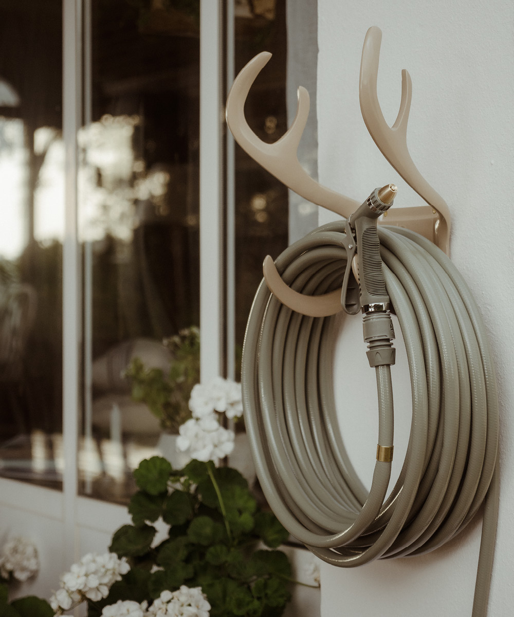 The beige reindeer shaped hose rack is designed and manufactured in Sweden, it is made of aluminum and endures rough weather. They come with a 5-year warranty. The eucalyptus leaf garden hose has a knitting reinforcement around the inner tube which makes the hose pliable and non-kinking as all our coloured garden hoses. The plastic surface is dirt-repellent and UV-protected to prevent bleaching from sun exposure, so your garden hose will keep its perfect color for years and years. All hoses are made of PVC and free from lead, cadmium and phthalates. The hose comes in 20 meter, If you need longer, easy – just buy an additional one. We provide you the extension connector for free. Each trigger nozzle is compatible with all ½” water hoses. Comes with fittings compatible with taps worldwide.