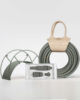 This kit contains an elegant soft green hose, a matching hose holder and a nozzle set in the same shade.
