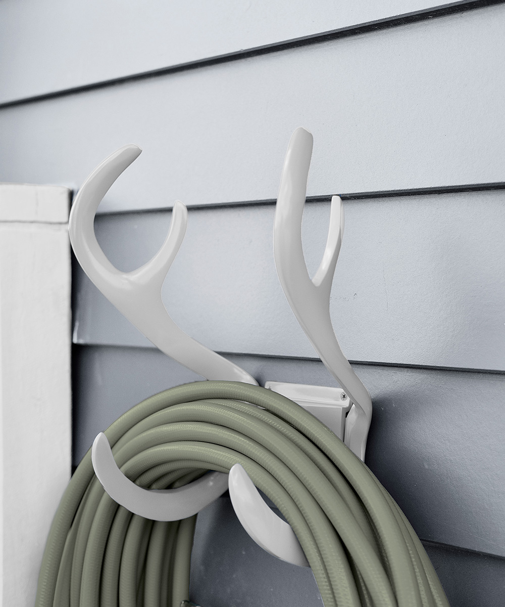 The grey reindeer shaped hose rack is designed and manufactured in Sweden, it is made of aluminum and endures rough weather. They come with a 5-year warranty.