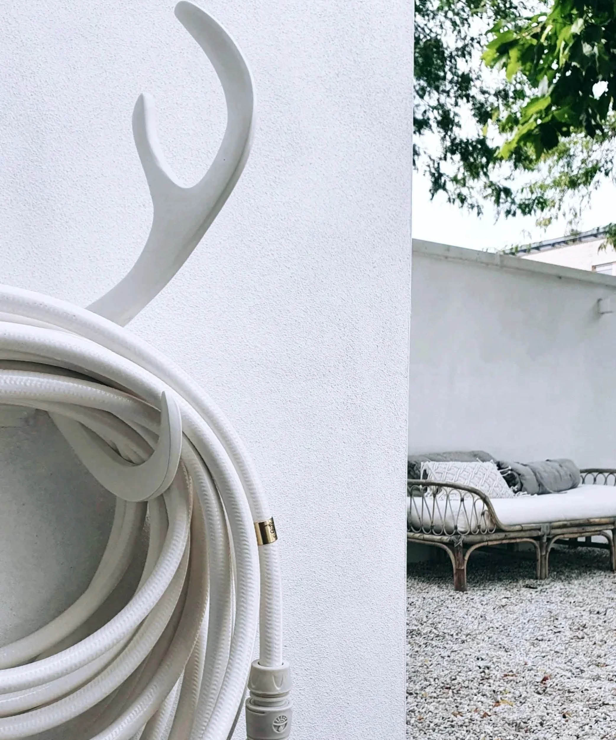 Der weiße geweihförmige Schlauchhalter wurde in Schweden entworfen und hergestellt. Er besteht aus Aluminium und hält rauem Wetter stand. Das Produkt besitzt eine 5-jährige Garantie. Der White-Snake-Gartenschlauch hat rund um den Innenschlauch eine Flechtverstärkung, die den Schlauch wie alle unsere farbigen Gartenschläuche biegsam und knickfest macht. Die Kunststoffoberfläche ist schmutzabweisend und UV-geschützt, um ein Ausbleichen durch Sonneneinstrahlung zu verhindern. Dadurch behält Ihr Gartenschlauch viele Jahre lang seine perfekte Farbe. Alle Schläuche sind aus PVC gefertigt und frei von Blei, Cadmium und Phthalaten, so dass unbedenklich daraus getrunken werden kann. Die Rosen werden Gesänge anstimmen, während der Schlauch sie mit reichlich sauberem Wasser verwöhnt. Der Schlauch hat eine Länge von 20 Metern. Wenn Sie mehr Länge benötigen, kaufen Sie einfach einen zweiten. Das Verbindungsstück für die Verlängerung erhalten Sie gratis. Die White Snake-Düse und die Armaturen sind aus Kunststoff gefertigt. Wählen Sie beim Wässern zwischen Wasserstrahl, weichem Regen und Nebel. Unser Reindeer-Schlauchhalter ist aus Aluminium gefertigt. Er ist mit einer Pulverbeschichtung versehen und wird, an der Hausfassade angebracht, zum echten Hingucker. Ein dekorativer Gartenschlauchhalter, der Sonneneinstrahlung und rauer Witterung standhält.