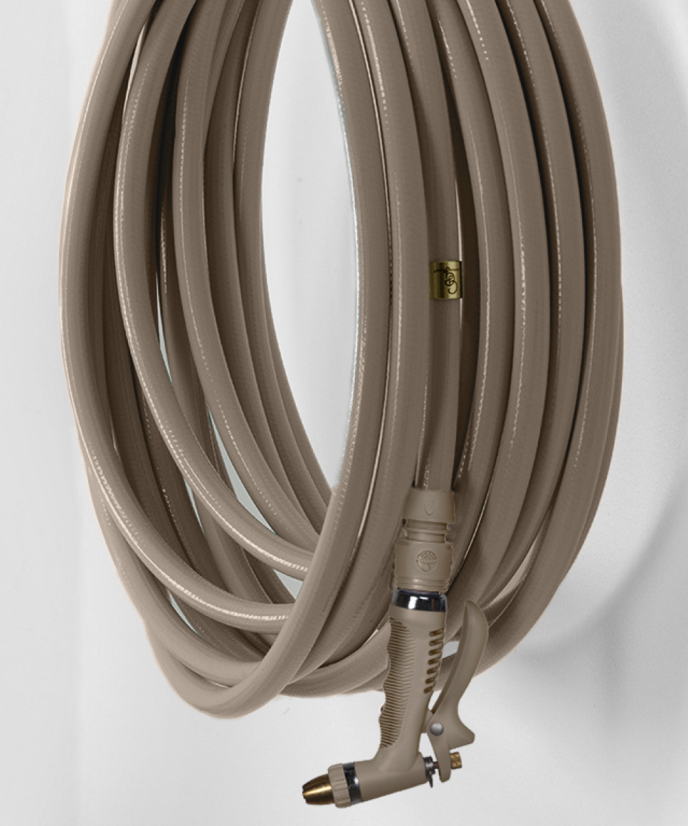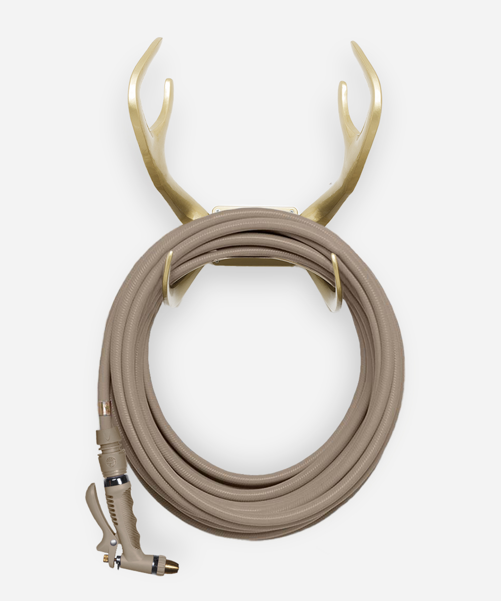 The gold reindeer shaped hose holder is designed and manufactured in Sweden, it is made of aluminum and endures rough weather. They come with a 5-year warranty. The beige garden hose called Sahara Desert has a knitting reinforcement around the inner tube which makes the hose pliable and non-kinking as all our coloured garden hoses. The plastic surface is dirt-repellent and UV-protected to prevent bleaching from sun exposure, so your garden hose will keep its perfect color for years and years. All hoses are made of PVC and free from lead, cadmium and phthalates. The hose comes in 20 meter, If you need longer, easy – just buy an additional one. Each trigger nozzle is compatible with all ½” water hoses. Comes with fittings compatible with taps worldwide. We provide you the extension connector for free. The roses will sing while the hose is spoiling them with lots of clean water.