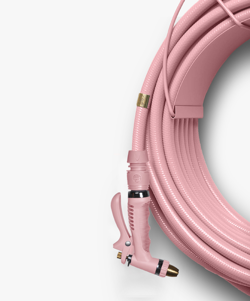 This blooming blossom kit contains a soft pink hose, a matching and decorative hose holder and a trigger nozzle with all fittings needed in the same pink. The knitting reinforcement around the inner tube of our coloured garden hose makes the hose pliable and non-kinking. The plastic surface is dirt-repellent and UV-protected to prevent bleaching from sun exposure, so your garden hose will keep its perfect color for years and years. All hoses are made of PVC and free from lead, cadmium and phthalates.