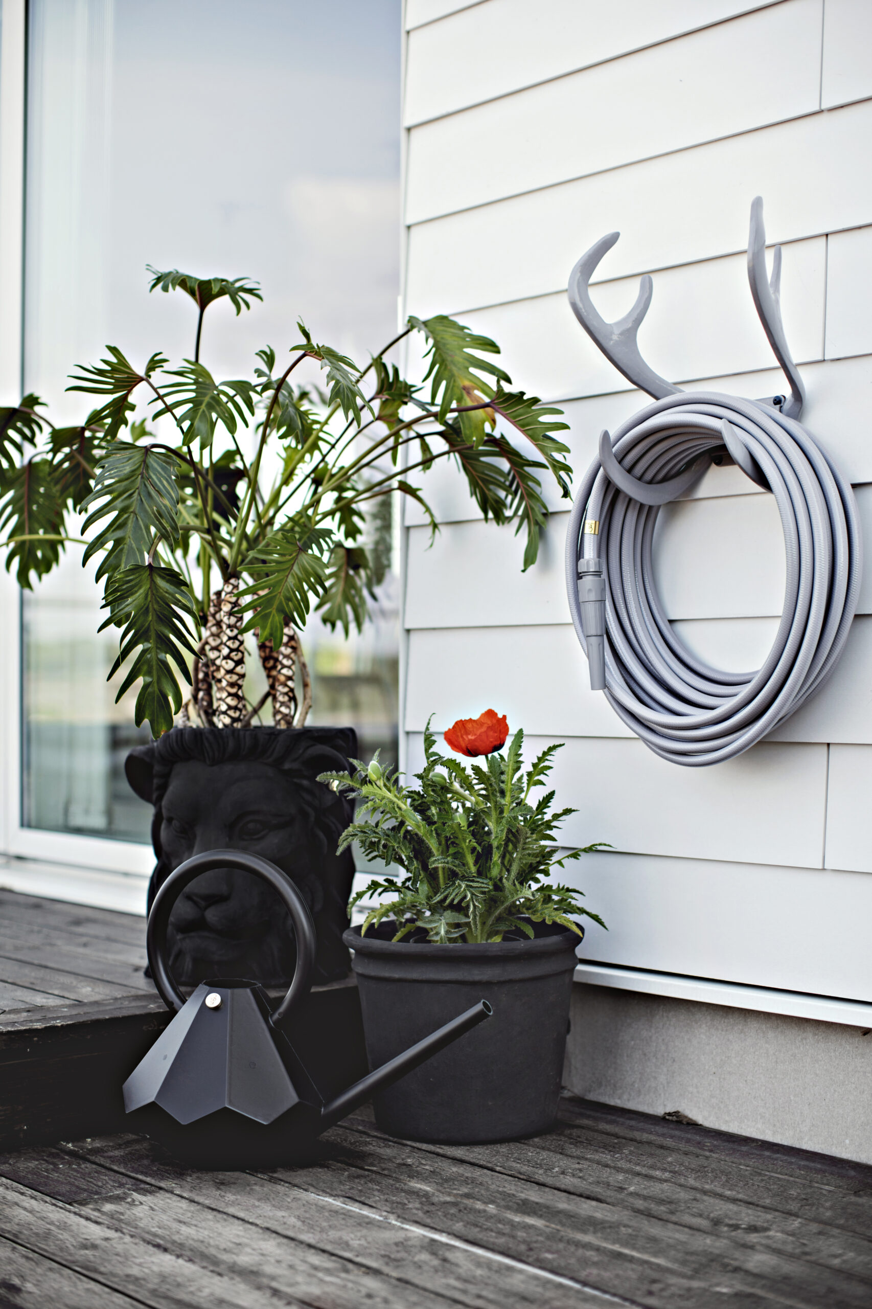 The grey reindeer shaped hose rack is designed and manufactured in Sweden, it is made of aluminum and endures rough weather. They come with a 5-year warranty. The grey garden hose called Graceful Rock has a knitting reinforcement around the inner tube which makes the hose pliable and non-kinking as all our coloured garden hoses. The plastic surface is dirt-repellent and UV-protected to prevent bleaching from sun exposure, so your garden hose will keep its perfect color for years and years. All hoses are made of PVC and free from lead, cadmium and phthalates. The roses will sing while the hose is spoiling them with lots of clean water. The hose comes in 65 feet, If you need longer, easy – just buy an additional one. We provide you the extension connector for free. The grey nozzle is made of plastic. Choose between jet, soft shower and mist when watering. Our Reindeer hose rack is made of aluminum. It is powder coated and serve as the icing on the cake when mounted on the facade of the house. A decorative garden hose holder that withstand sun exposure and tough weather conditions.