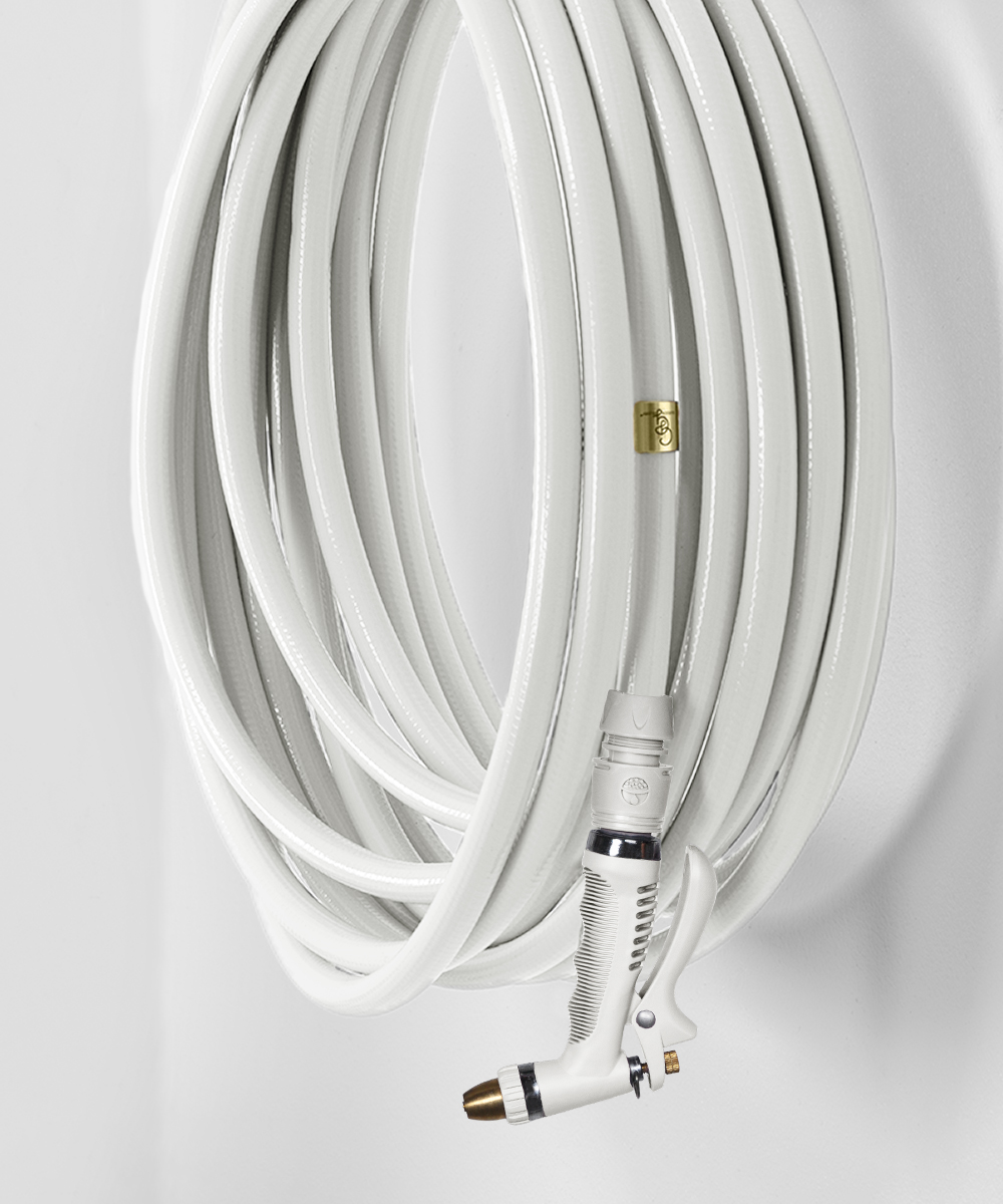 This du set contains a creamy white garden hose, and a trigger nozzle set in the same creamy white. The knitting reinforcement around the inner tube of our coloured garden hose makes the hose pliable and non-kinking. The plastic surface is dirt-repellent and UV-protected to prevent bleaching from sun exposure, so your garden hose will keep its perfect color for years and years. All hoses are made of PVC and free from lead, cadmium and phthalates and will last you a lifetime. The hoses comes in 65 feet, If you need longer, easy – just buy two. We provide you the extension connector for free. The trigger nozzle is compatible with all ½” water hoses. Wall mount is not included in this combination.